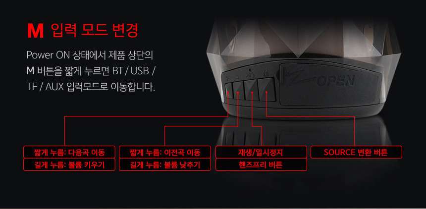 스마트폰, 태블릿 PC등 스마트 기기의 음원을 무선으로 재생할 수 있으며 마이크 탑재로 음악감상중에도 핸즈프리 통화를 할 수 있습니다. 블루투스 무선 연결 및 TF, USB, AUX 입력단자를 지원하여 어디서든 다양한 긱기와 활용할 수 있습니다. 고품격 52mm 풀레인지 유닛이 제품 상단에 탑재되어 8W 출력의 강력한 사운드를 발휘하며 LED 디스플레이의 다양한 라이팅 효과를 통해 시각적으로도 즐거운 음악감상이 가능합니다. BZ-A190 LED는 일반 휴대용 스피커를 상회하는 강력한 사운드는 물론 전방향 화려하거나 은은한 조명효과를 통해 무드 조명 제품으로도 활용할 수 있습니다.